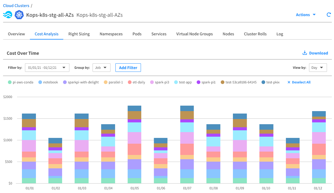 The bar chart shows the cost of your workload over time. The default display breaks down each bar into different namespaces and represents the daily cost over the last week. Modify the time period and groupings according to your needs. See Grouping Options below for more information.
